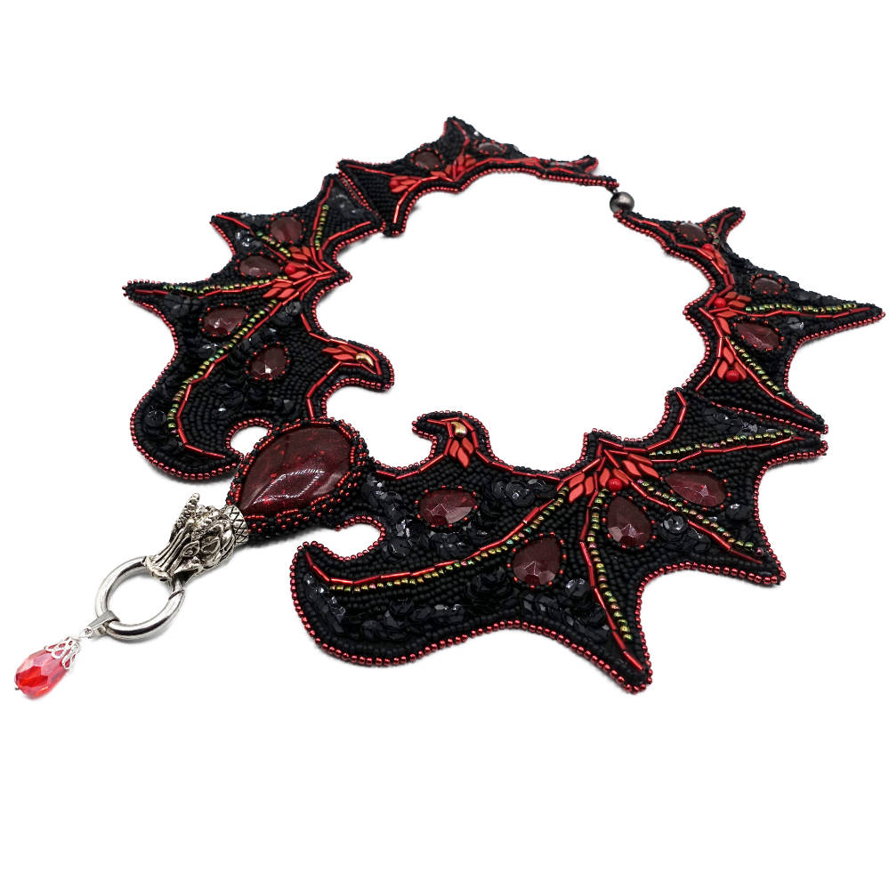 Im Zentrum des Colliers thront ein kunstvoll gefertigter Drachenkopf aus silberfarbenem Metall. Der eindrucksvolle Kopf hält einen massiven Ring im Maul, an dem ein blutroter Glastropfen herabhängt – ein symbolträchtiges Element, das die dramatische Gesamtwirkung dieses Colliers unterstreicht. Der Ring ist nicht nur ein dekoratives Highlight, sondern lässt sich öffnen und bei Bedarf entfernen oder durch ein anderes Schmuckstück ersetzen, was dem Träger vielfältige Variationsmöglichkeiten bietet. Ein praktischer Magnetverschluss sorgt für einfaches Anlegen und sicheren Halt, ohne den eleganten Gesamteindruck zu stören.