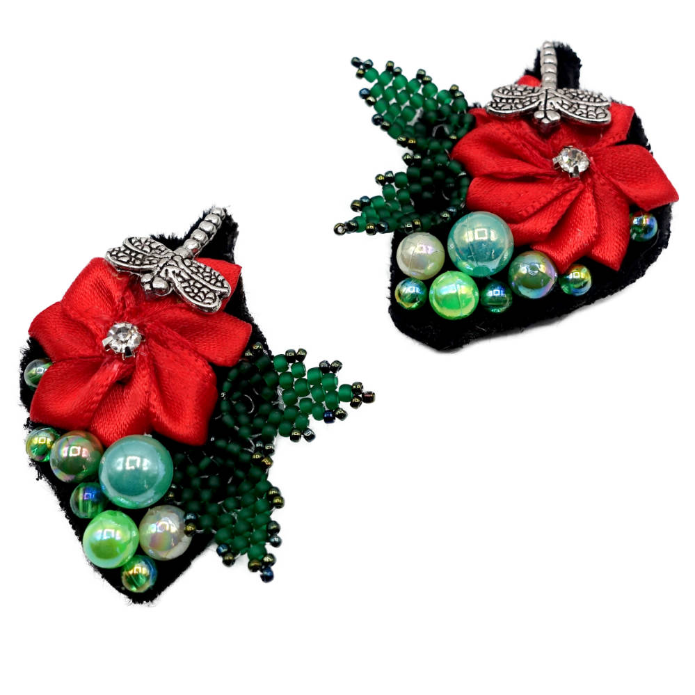 Auffallende, handgefertigte Schuhclips mit roten Blüten und kleinen Libellen aus Metall – ein einzigartiger Schuhschmuck, der jedes Outfit veredelt und für stilvolle Akzente sorgt.