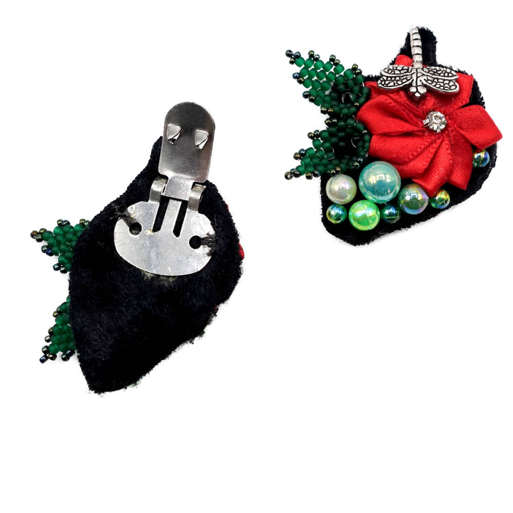 Jede Blume ist aus Stoff gestaltet, in einem lebendigen Rot, das sich harmonisch mit eleganten Perlen kombiniert und von einer charmanten, fein gearbeiteten Libelle aus Metall begleitet wird.